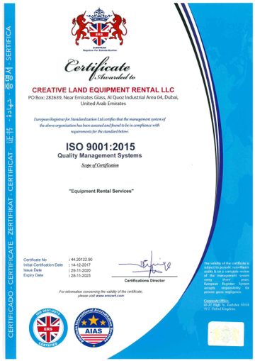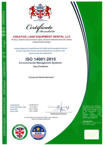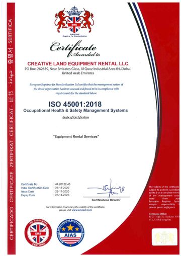 Creative Land Equipment Rental LLC works in compliance with QRS requirements. We are OHSAS 18001:2007, ISO 14001:2015 and OHSAS 18001: 2007 certified.